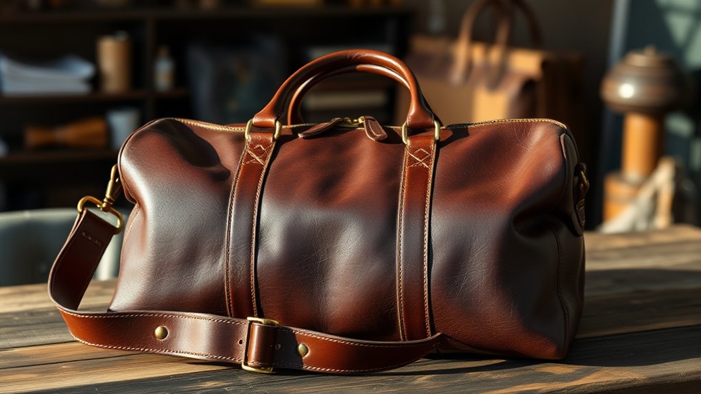 Proper maintenance is essential to keep your premium leather duffle looking its best and lasting for years. Regularly conditioning it with a high-quality leather moisturizer keeps the leather supple and prevents cracking. Protect the bag from excessive moisture and water exposure, which can cause stains or damage. When cleaning, use a soft, damp cloth to remove dust and dirt, avoiding harsh chemicals that could harm the leather’s natural luster. Allow your duffle to air out in well-ventilated areas to reduce odors and maintain its natural scent. When not in use, store it in a breathable dust bag or cover to shield it from dust and environmental elements. Proper care guarantees your bag remains functional and stylish for many trips ahead.