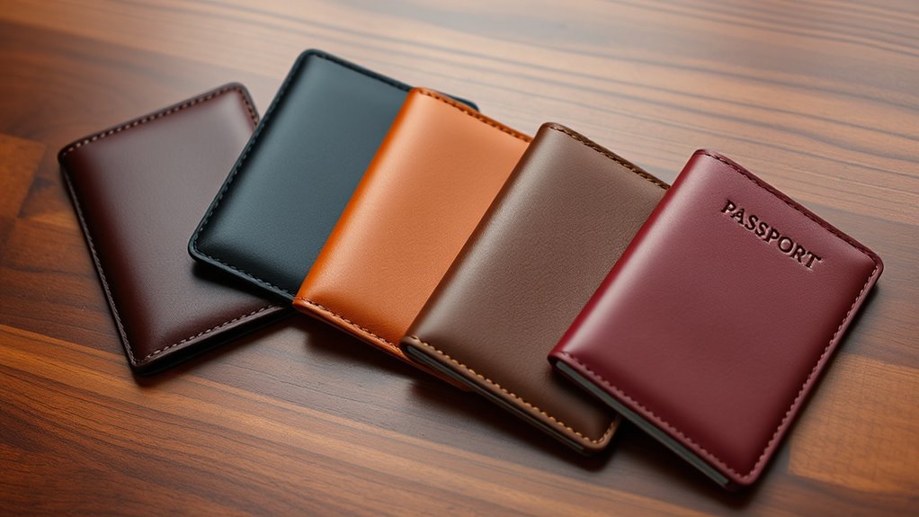 Choosing a premium leather passport holder set hinges largely on material quality and durability. High-quality leather, like full grain or top-grain, offers strength, resistance to wear, and develops a beautiful patina over time. While synthetic or PU leather may feel softer and cost less, they tend to crack, peel, and don’t last as long. Look for double-stitched edges and reinforced seams, which indicate better craftsmanship and enhance durability. Properly treating genuine leather with conditioner can extend its lifespan, keep it looking new, and prevent cracking. Moisture resistance also varies—genuine leather can be treated to resist water, but untreated leather may warp or stain when exposed to moisture. Prioritizing quality materials guarantees your passport holder remains a reliable and stylish travel companion.