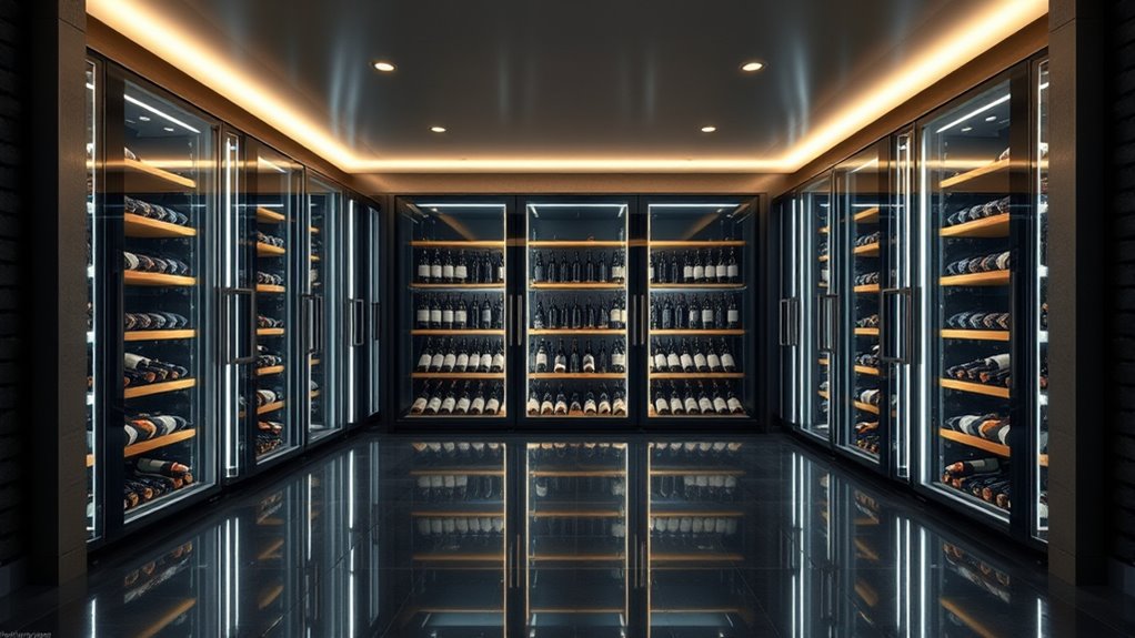 UV and vibration protection are essential features to contemplate because they directly impact the long-term preservation of your wine. UV protection is typically achieved through double-pane or UV-resistant glass doors that block over 99% of harmful rays, preventing premature aging and flavor loss. Vibration protection comes from advanced cooling systems—either compressor or thermoelectric—that minimize movements that could disturb sediment and hinder proper aging. Proper insulation and anti-vibration shelving further dampen external shocks and internal shifts, maintaining a stable environment. Many premium units combine these technologies to create a controlled setting that closely mimics cellar conditions. Prioritizing UV and vibration protection ensures your wines develop their full potential over time, preserving aroma, flavor, and sediment integrity for the best tasting experience.