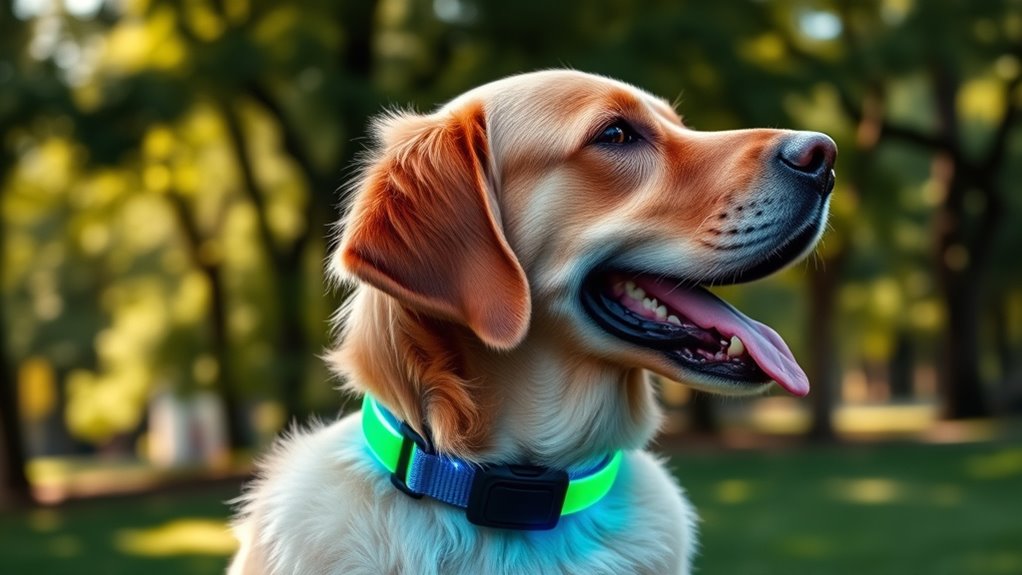 Selecting the right size and fit for a smart dog collar guarantees it stays secure and comfortable during everyday activities. I recommend choosing a collar that’s adjustable to fit your dog’s neck comfortably, typically between 9 and 30 inches, depending on the model. It’s important to check the collar’s weight to ensure it’s suitable for your dog—most are designed for dogs over 8 or 15 pounds. The material should be lightweight and ergonomic to prevent discomfort, especially during long wear or active play. Look for collars with multiple sizing options or adjustable straps to accommodate growth or different breeds. Finally, consider the overall design to ensure it stays secure and doesn’t slip off, particularly if your dog is highly active or large.