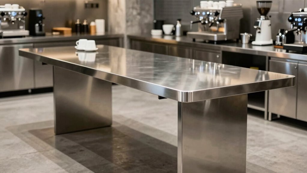 Choosing the right stainless steel work table for your coffee bar involves careful budget planning. I recommend setting a clear budget range before shopping to narrow your options and prevent overspending. Keep in mind that thicker gauge stainless steel is generally more durable but also more expensive. Balance your initial investment with long-term value by considering durability, maintenance costs, and lifespan. Look for features that match your needs, like adjustable shelves or mobility, to avoid paying for unnecessary extras. Higher-priced tables often include certifications or warranties, which can add to their value. Ultimately, weighing upfront costs against potential savings from durability and features helps you choose a table that fits your financial plan and supports your coffee bar’s efficiency.