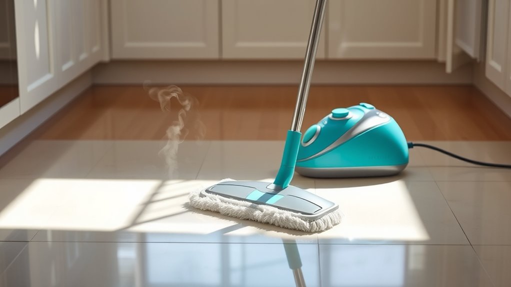 How do you guarantee your hardwood and tile floors stay in top condition while effectively cleaning? One vital factor is steam temperature control. With adjustable settings, I can customize the heat level to suit different floor types and cleaning needs, preventing damage from excess heat. Precise temperature regulation allows me to tackle stubborn stains without risking warping or discoloration. I find that maintaining an ideal steam temperature, usually between 230°F and 260°F, is essential for sanitizing surfaces and eliminating bacteria safely. Plus, many steam mops offer digital or manual controls for easy switching between low, medium, and high settings, making my cleaning process more efficient and environmentally friendly. Overall, controlling steam temperature is key to protecting my floors while achieving a deep clean.