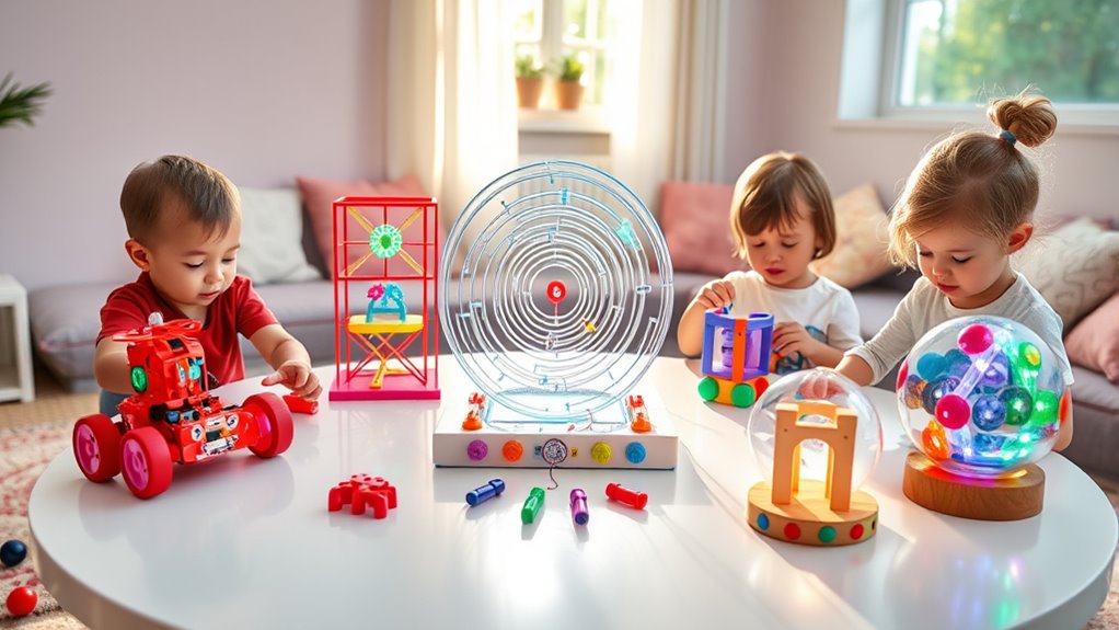 Selecting STEM toys that match a toddler’s developmental stage guarantees they can enjoy and benefit from play without feeling overwhelmed. For ages 1-3, choose toys with large, simple pieces that promote basic problem-solving and fine motor skills. These toys should be easy to manipulate and safe for little hands. For ages 3-6, opt for slightly more complex options like magnetic tiles or simple assembly kits that challenge reasoning without causing frustration. As children approach 6-8, select toys featuring gears, robotics, or detailed models that align with their growing cognitive abilities. Always check age recommendations and safety warnings on the packaging. Matching the toy’s complexity to their developmental stage ensures engaging, safe, and meaningful learning experiences.