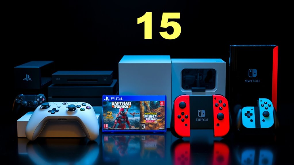 When selecting a game console, paying attention to controller features can considerably enhance your gaming experience. Look for controllers with ergonomic design and responsive buttons to ensure comfortable, precise gameplay during long sessions. Wireless controllers are a great choice, especially those with stable Bluetooth or RF connections and a range of at least 30 feet, giving you freedom to move around. If you enjoy multiplayer gaming, verify that the controller supports multiple players simultaneously. Battery life is also important; controllers with rechargeable batteries or long-lasting AA batteries add convenience and reduce interruptions. Finally, double-check compatibility with your console or device, ensuring the controller works seamlessly with your system’s standards and ports. These features collectively create a more enjoyable and hassle-free gaming experience.