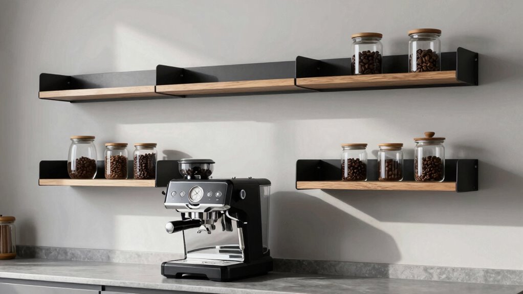 Choosing the right materials for wall-mounted shelves makes a big difference in how well they hold up over time. Durable options like solid wood, metal, or high-quality particleboard can support the weight of espresso machines and accessories reliably. Shelves with moisture-resistant and scratch-resistant finishes, such as laminated or treated surfaces, maintain their appearance and structural integrity in humid or busy environments. Heavy-duty brackets and strong mounting hardware are essential to securely support the machine’s weight, which can be 10 to 20 pounds or more. The material also affects load capacity—thickened metal frames and reinforced wood panels typically support more weight than thinner options. Plus, choosing corrosion-resistant materials like powder-coated metal or treated wood extends the lifespan, especially in kitchens exposed to steam and humidity.